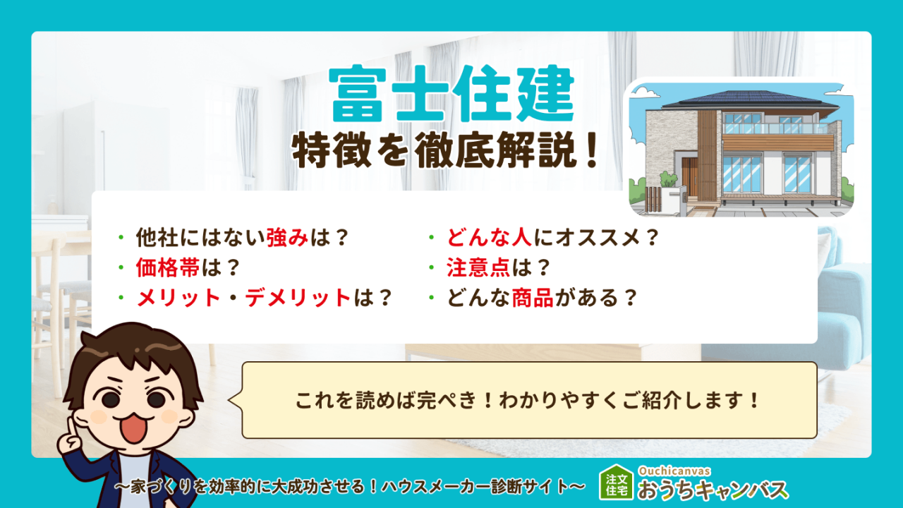 そこでこの記事では、富士住建の特徴から坪単価・標準仕様・全5商品のラインナップ・メリットデメリットまで、初心者の方にもわかりやすく、まるっとまとめました!