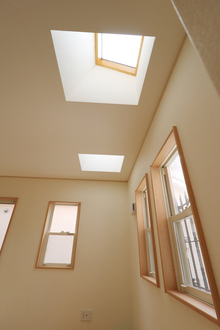 実は、天窓は室内を明るくするために一番効果的で効率的な採光方法になっています。 建築基準法上では、一般の壁面の窓に比べ、なんと3倍もの採光効果があると規定されているんです!